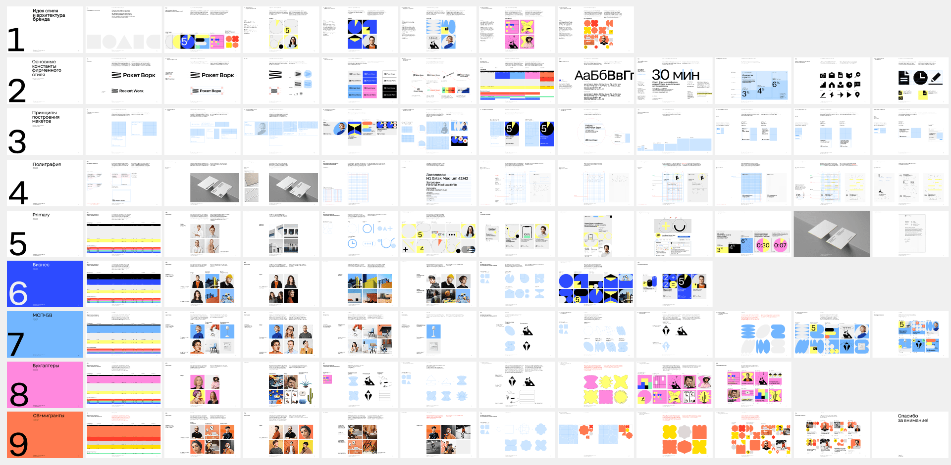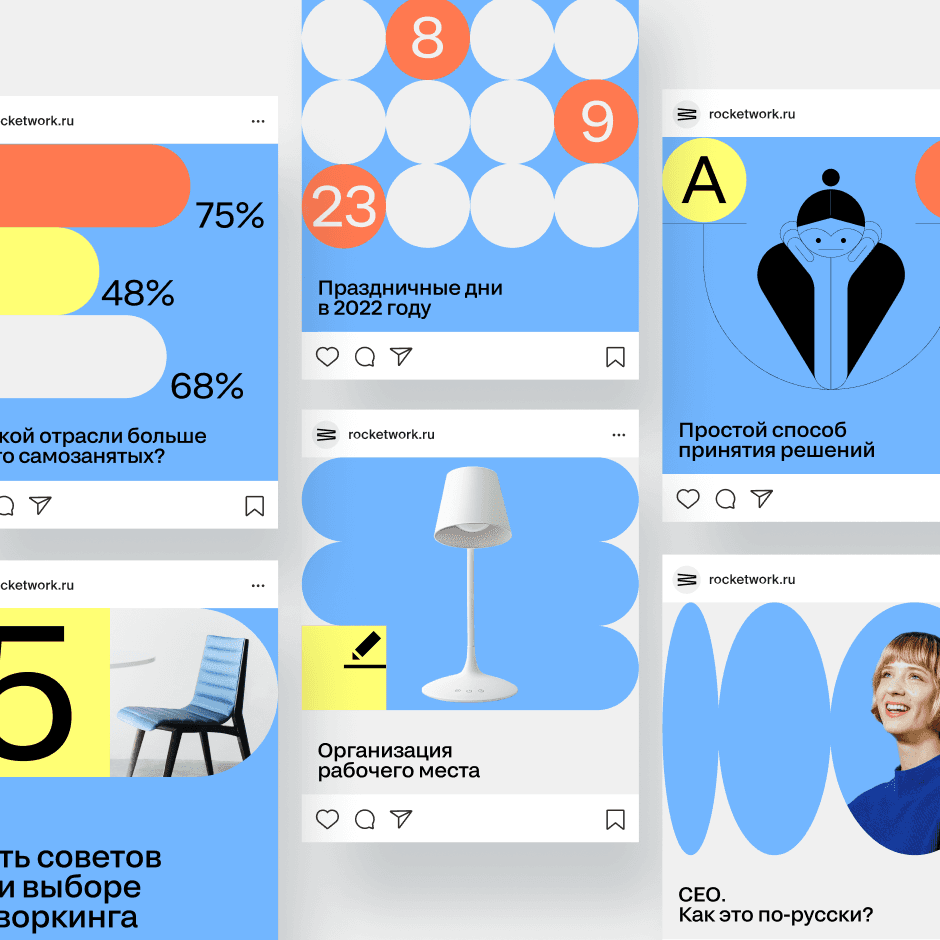 As a designer, I played an active role in the Rocket Work project, contributing significantly to the development of a comprehensive visual ecosystem for the brand. One of the core tasks was creating a large-scale, deeply detailed analytical design system from scratch. This system encompassed hundreds of slides tailored to various client categories and target audiences. It included clear guidelines on color usage, typography, layout structures, and visual components, along with standards for presentations, banners, and other marketing and product-related materials. The design system covered the entire visual identity of the brand — from the logo and branding to all supporting materials used both internally and externally. I was also responsible for developing a wide range of presentations — from investor and client decks to internal communications for the team. These included animated presentations, visual concepts for the app, social media banners, post-campaign materials, and other key design assets used across the company’s communication channels.